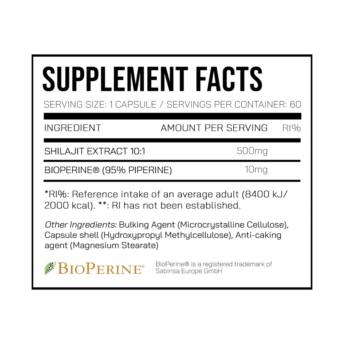 Unlock your peak performance with Shilajit by DNA Sports, a premium, all-natural supplement designed to boost energy, enhance endurance, and support overall vitality. Each capsule contains 10:1 Shilajit extract, known for its rich mineral content and potent antioxidant properties. With 60 easy-to-swallow capsules, you'll get 60 powerful servings of this ancient, nutrient-dense resin, trusted for centuries to improve stamina, promote mental clarity, and support healthy aging.
