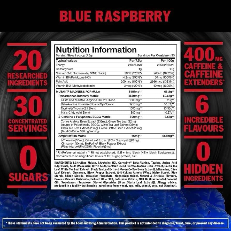 MUTANT MADNESS seizes the pre-workout experience and launches it into the stratosphere! This maximum-strength formula will jolt your senses and help you demolish your next workout. Sick pumps, razor-sharp focus and unstoppable intensity await you.* We warn you — read the entire label first before trying — MUTANT MADNESS must be used responsibly!