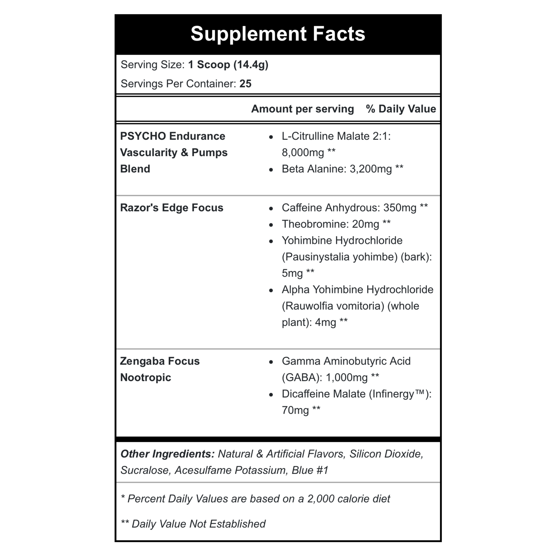 Edge of Insanity is Psycho Pharma’s flagship pre-workoutfor athletes who crave brutal intensity, tunnel-vision focus, and skin-splitting pumps. Built around an oversized citrulline/β-alanine base and a two-phase stimulant system, it delivers relentless drive from the first rep to the last set—perfect for hardcore lifters, stim veterans, and anyone who trains on the edge.